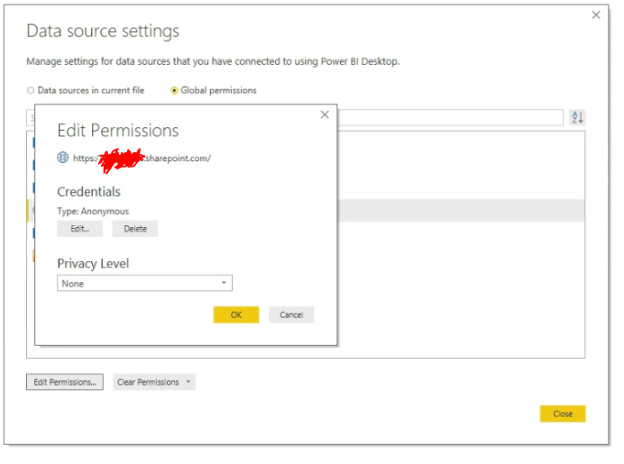 - Then Select the Sharepoint Resource you are attempting to connect to, then Select “Edit Permissions” then under Credentials Click “Edit” from here select the appropriate type of account for sharepoint Authentication within your company. In this case since we are using Office 365 we will select Organizational Account and Sign In with your Office 365 Credentials for the specified Sharepoint Location. If you are unsure about how your company’s Sharepoint is setup, please contact your IT Department.